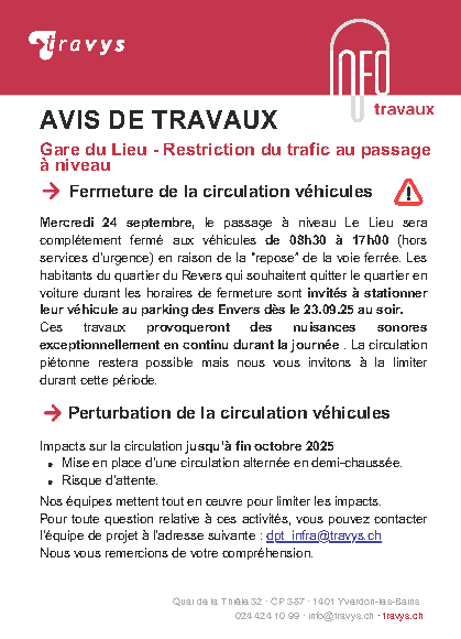 Dans le cadre de travaux de renouvellement de la voie ferrée, le passage à niveau du Lieu sera complètement fermé à la circulation des véhicules le mercredi 24 septembre 2025, de 08h30 à 17h00 (hors services d’urgence).