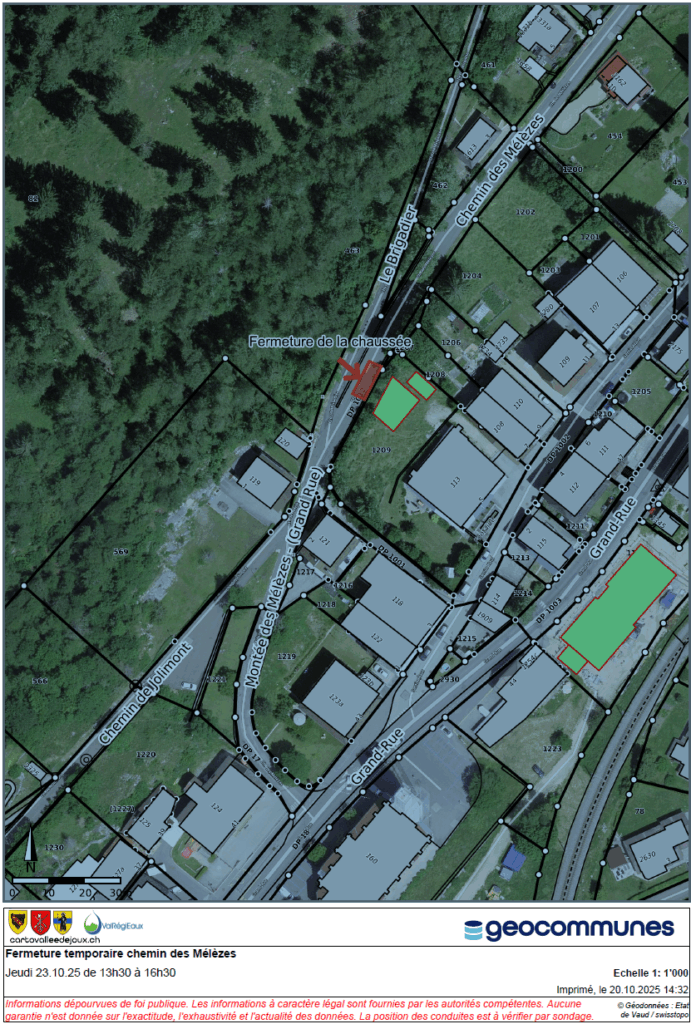Afin de procéder au bétonnage des combles du bâtiment de la parcelle 1209, l’entrée du chemin des Mélèzes, à la croisée chez le Brigadier, sera fermée jeudi 23.10.25 de 13h30 à 16h30.