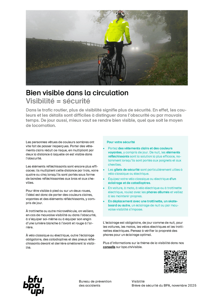 Le Bureau de prévention des accidents (BPA) rappelle, dans sa Brève de sécurité de novembre 2025, que plus de visibilité signifie plus de sécurité, pour tous les usagers.