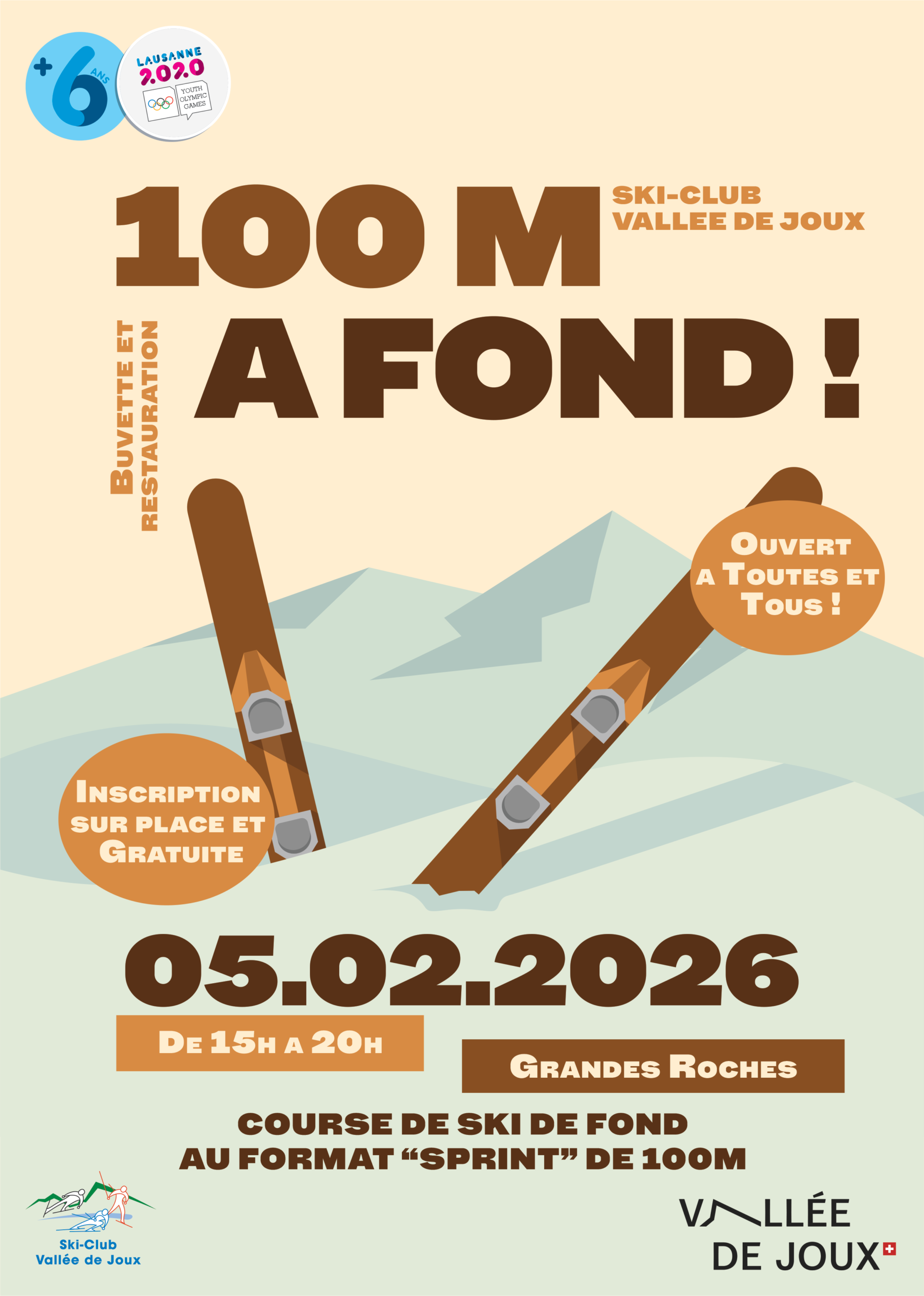 La Commune du Chenit, en collaboration avec le Ski-Club Vallée de Joux, invite la population à participer à l’événement sportif « 100 m à fond », une course de ski de fond au format sprint de 100 mètres, ouverte à toutes et tous.