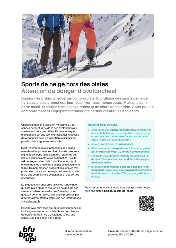 Chaque année en Suisse, en moyenne 21 personnes perdent la vie dans des avalanches survenant hors des pistes. L’évaluation du risque d’avalanche est complexe et nécessite des connaissances spécifiques ainsi qu’une préparation rigoureuse des sorties.
