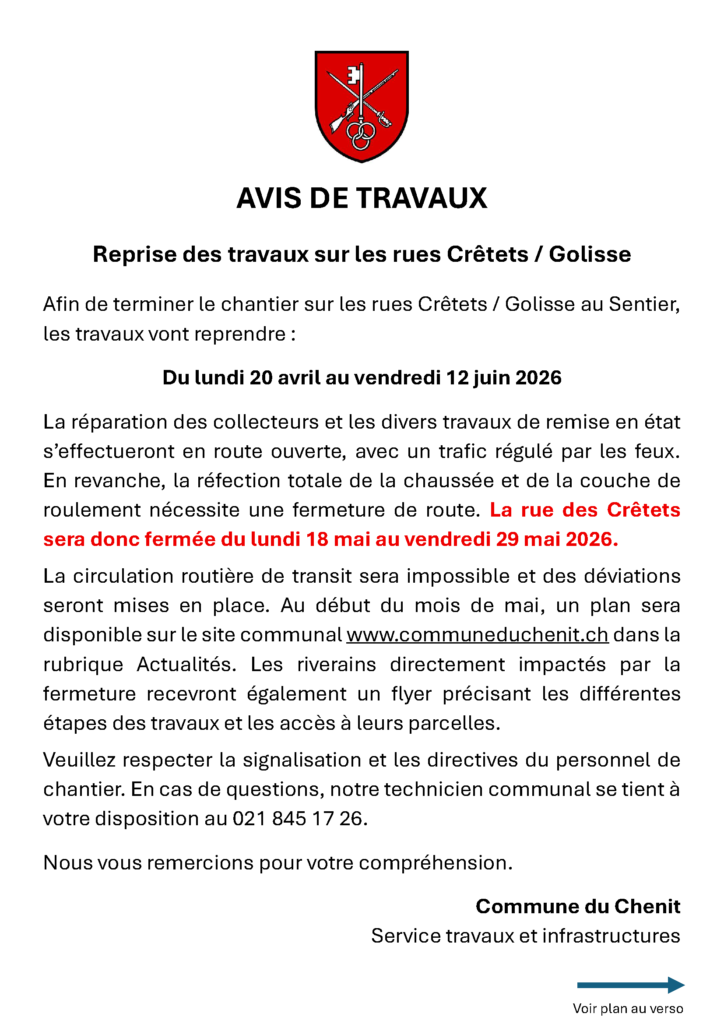 La Commune du Chenit informe la population de la reprise des travaux sur les rues des Crêtets et de la Golisse, au Sentier. Le chantier reprendra du lundi 20 avril au vendredi 12 juin 2026.