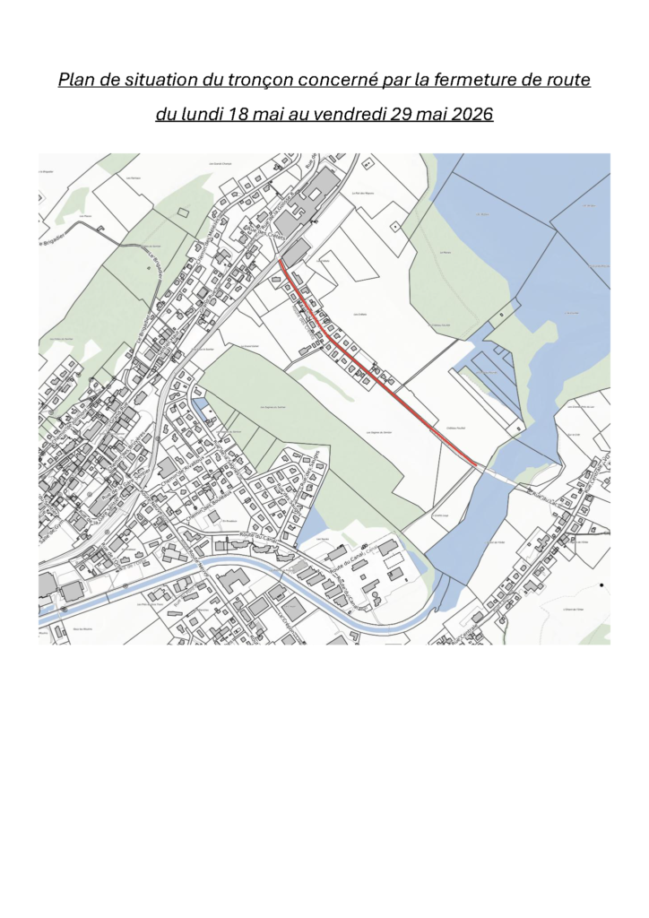 Durant cette période, la circulation de transit sera impossible et des déviations seront mises en place. Un plan de situation du tronçon concerné figure dans l’avis de travaux, qui sera publié sur le site communal dans la rubrique Actualités.